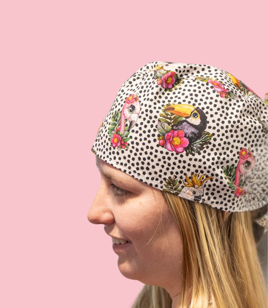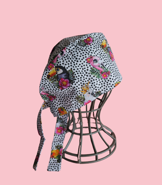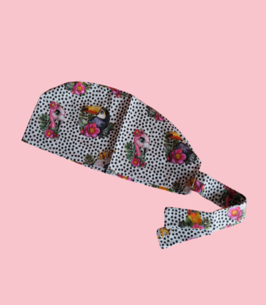 Sur un fond à pois noirs et blancs, des animaux tropicaux magnifiquement illustrés se mêlent à des fleurs éclatantes aux teintes roses et colorées. Le contraste est fort, joyeux, assumé. Ce calot attire le regard, suscite la curiosité et déclenche souvent des sourires, des petits moments précieux dans un quotidien vétérinaire parfois lourd émotionnellement.